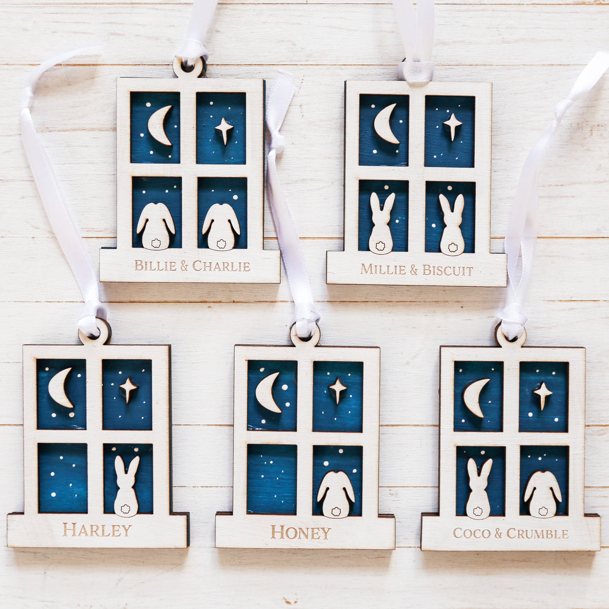 Add a unique touch to your Christmas décor with this Personalised Rabbit / Bunny Christmas Tree Decoration. Featuring a charming bunny rabbit silhouette set against a crescent moon and twinkling star, this custom ornament is perfect for rabbit and bunny lovers.