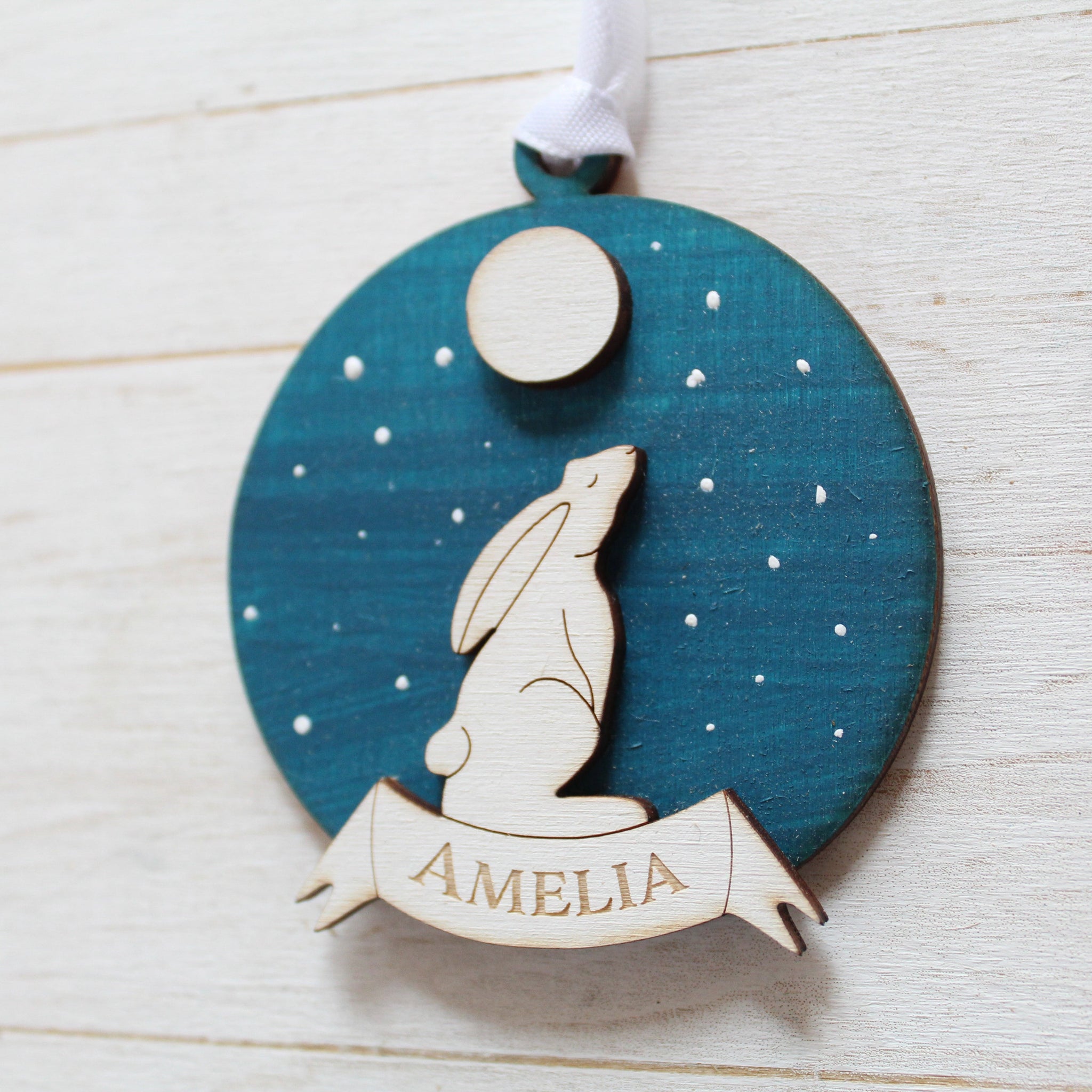 Our moon hare decoration can be personalised with name of your choice to create a lovely unique gift.